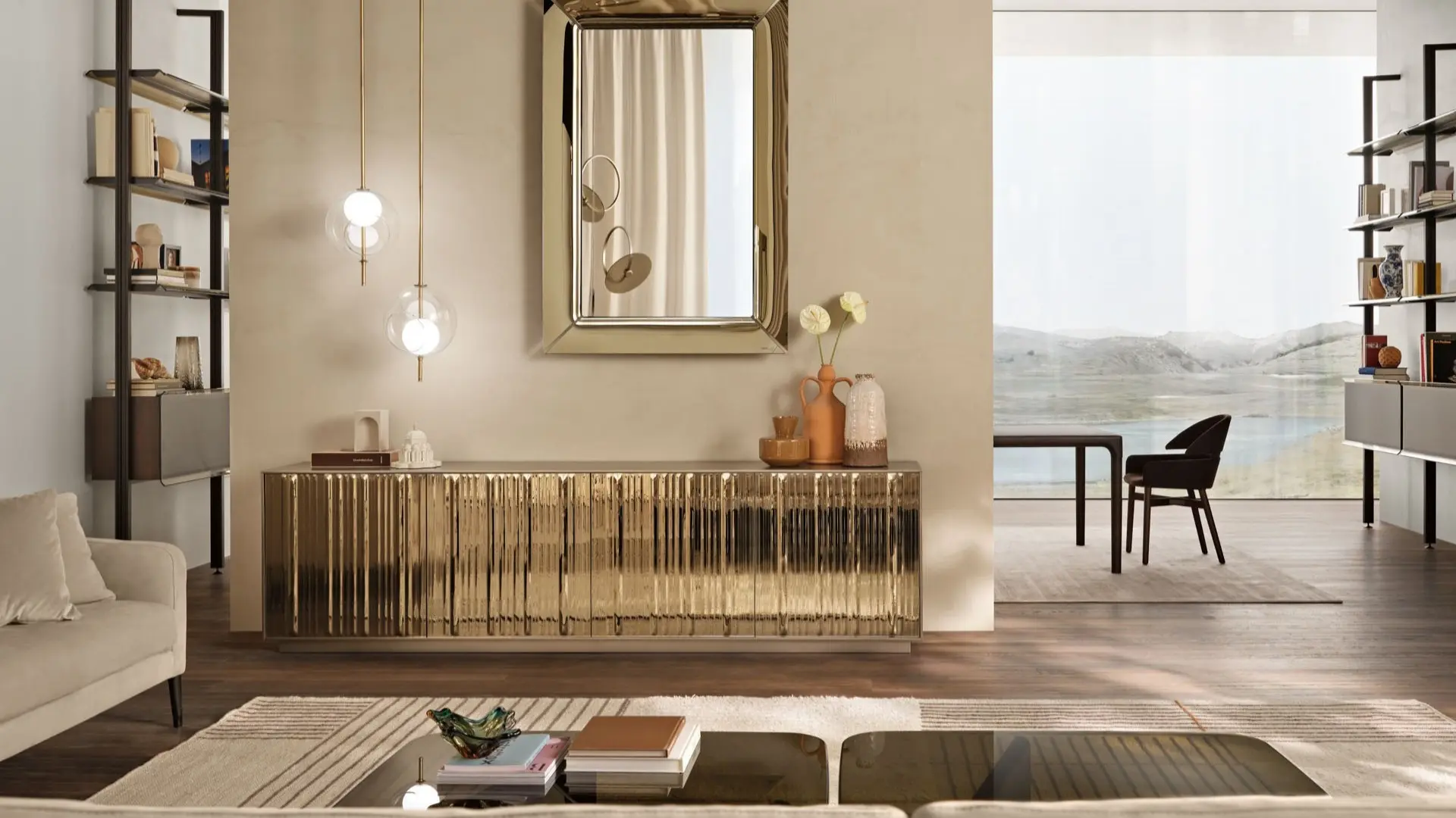 Cupboard with wooden lacquered structure in matt white, vulcan grey or Metallic Greige finish. Doors in 6 mm thick tempered glass, fused or flat, available in the following finishes: back painted or back silvered extralight glass; back painted acid-etched extralight glass; back silvered bronze glass. Inner shelves in 8 mm thick tempered smoke glass.