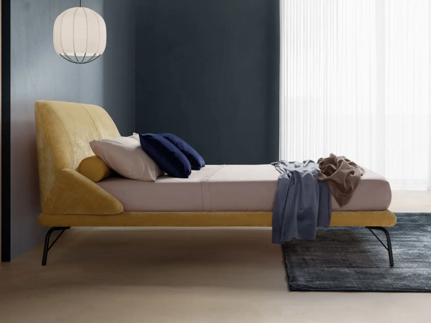 The Origami model owes its name to the ancient Japanese art of making small creations out of very light sheets of paper. And like the folds of the sheet that follow one another and overlap, the headboard of the Origami bed is composed of multiple geometric profiles, created with a single layer of upholstery.