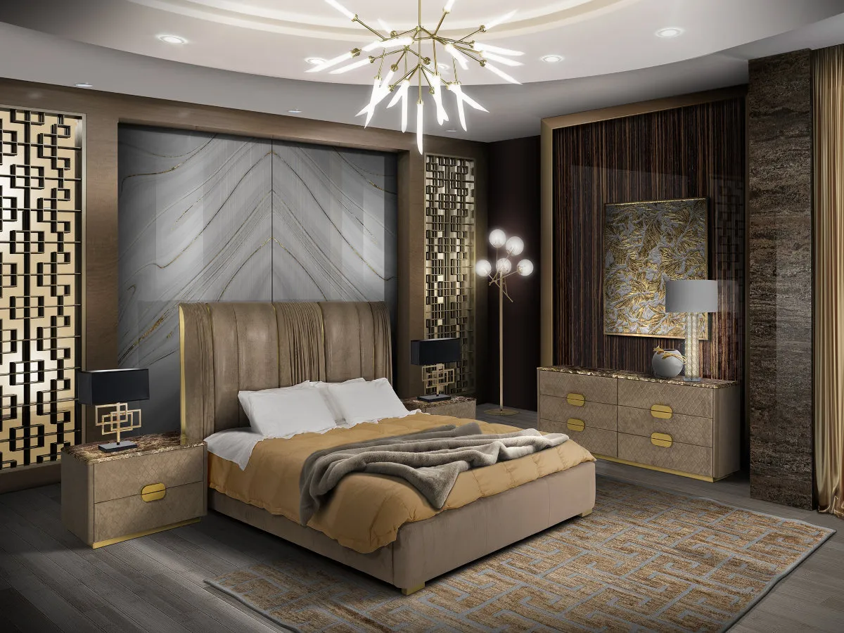 The Waldorf bed is available in standard or custom sizes and can be upholstered with Eco Nabuk or leather. The headborad metal decoration parts and bed frame feet are available in satin steel or can be varnished in any metallic finishes (please specify).