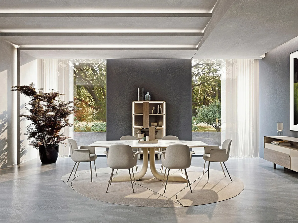 The chair from the Soul collection, designed to be combined with the table, is even more comfortable and welcoming thanks to the presence of the armrests integrated into the seat. Fully upholstered in leather or fabric, it has triangular section metal feet in the Matt Light Platinum finish.