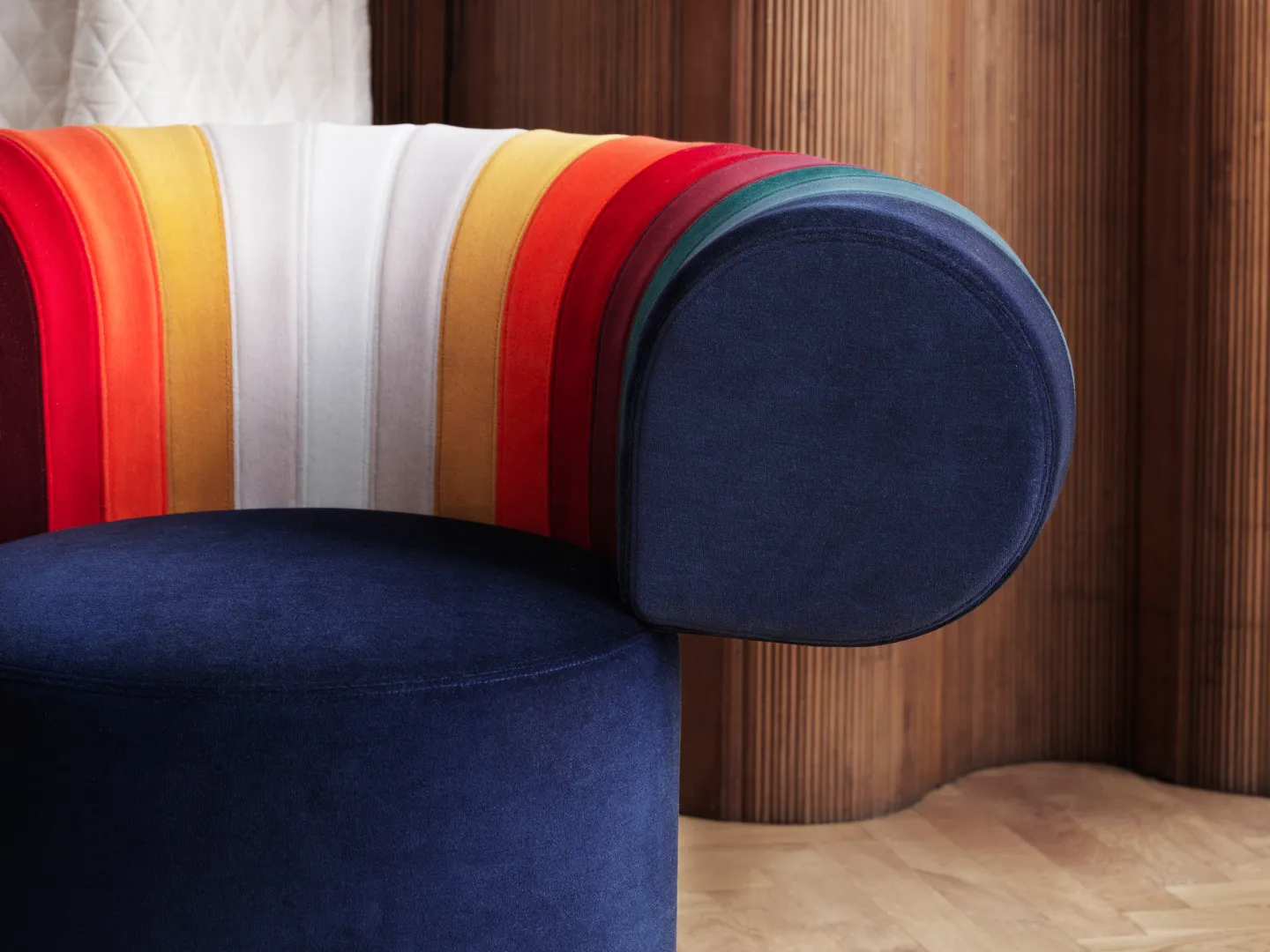 ”I’ve been inspired by textile swatches, like a fanning concentration of colour. The upholstery forms a modular tête-à-tête sofa or Victorian-era ‘love seat’ collection where two or more seats can be joined together in an undulating arrangement. Two people can have a quiet conversation (in keeping with Victorian modesty) side-by-side while viewing the back of the other person’s seat and the spectrum of graduated coloured bands.”