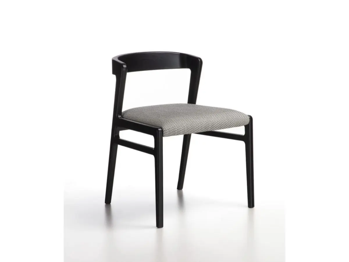Sedia della linea Aida dal design essenziale e leggero. Struttura in legno massello, disponibile in finitura Noce Canaletto o nera. Seduta con rivestimento in tessuto, pelle o nabuk
