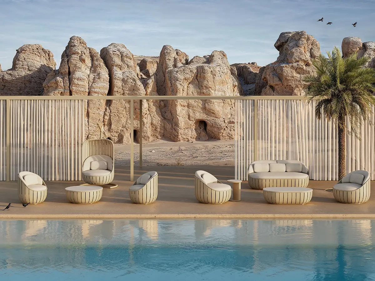 Arena fonde l'eleganza contemporanea con l'ispirazione organica e la maestria artigianale, offrendo durata e stile per gli spazi esterni. La collezione evoca i movimenti fluidi delle dune di sabbia che incarnano curve delicate ma potenti.