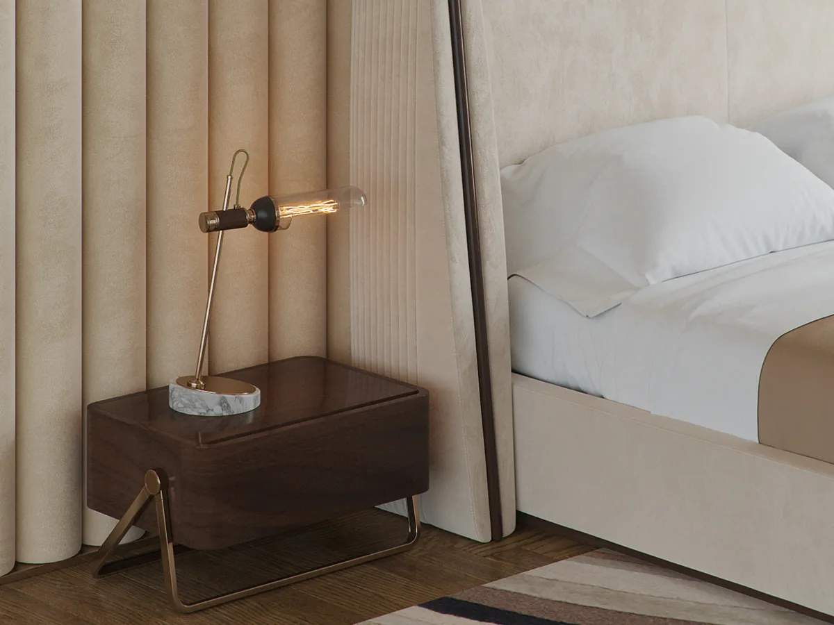 A sculptural lamp shape conceived in a beautiful blend of metal and glass has a real presence as a feature light in any interior. The upper body of the piece combined with a gentle inclination of the brass holding.