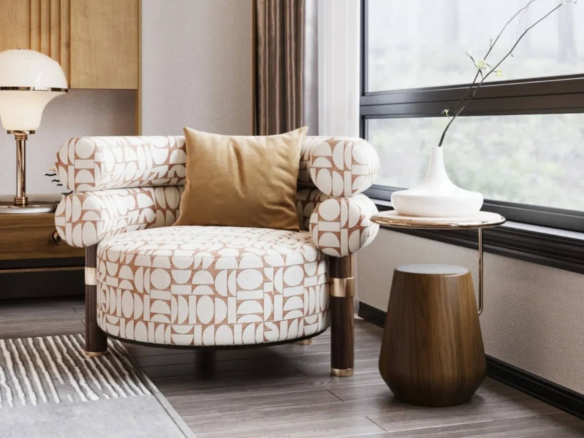 With a round shape and bold pattern, The Rogers Armchair seeks to live up to the name of the famous actress of the 50's Ginger Rogers. The fabric combined with the polished brass details makes the wooden feet stand out.